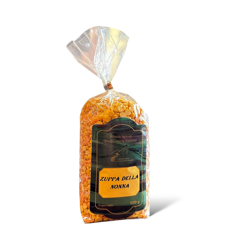 Zuppa della Nonna. Misto di legumi. Ingredienti: Ceci decorticati, lenticchia decorticata, cicerchia decorticata. Può contenere tracce di CEREALI contenenti GLUTINE, SOIA, SENAPE.